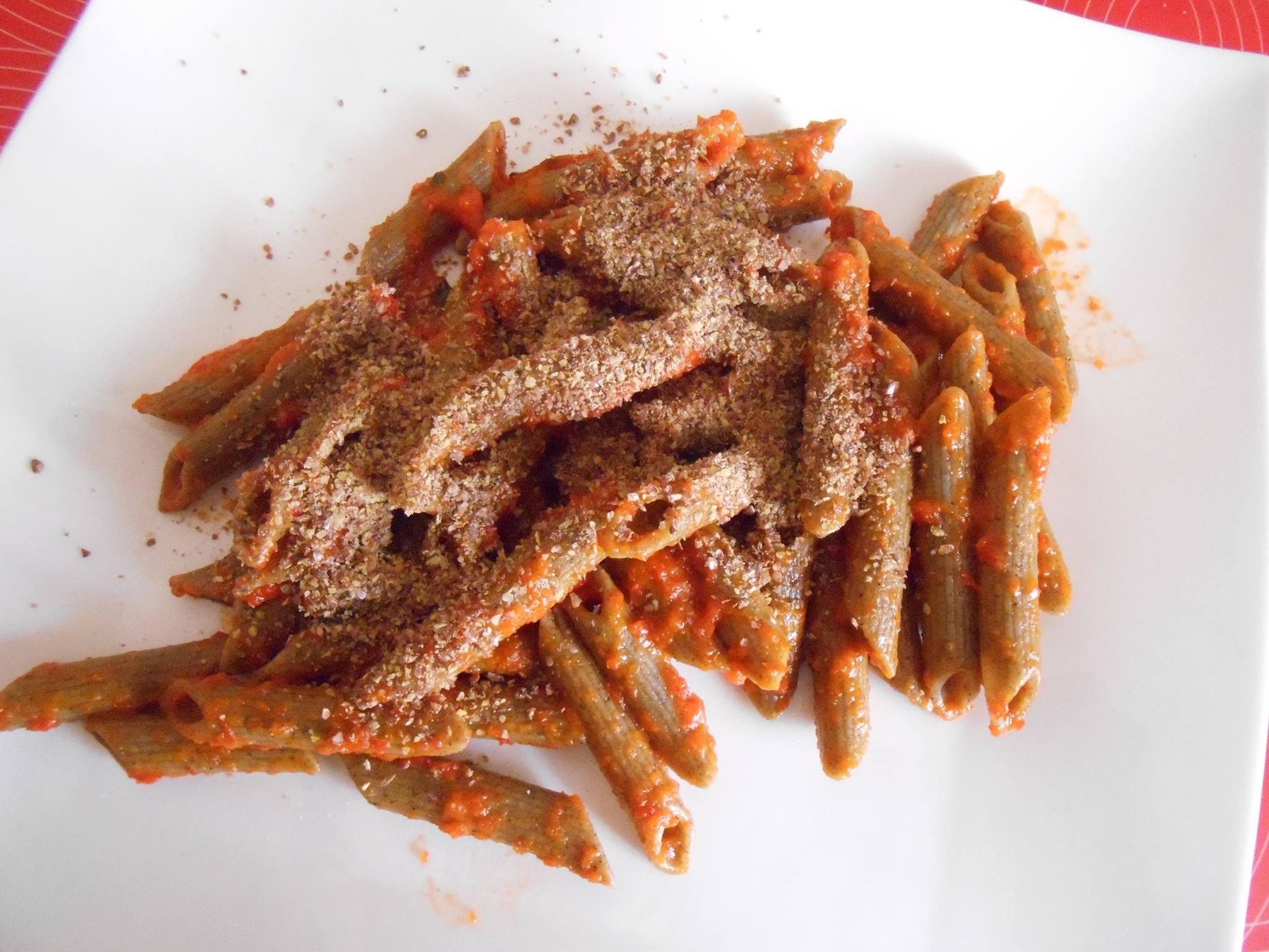 Penne di canapa sativa, salsa di peperoni e semi di lino