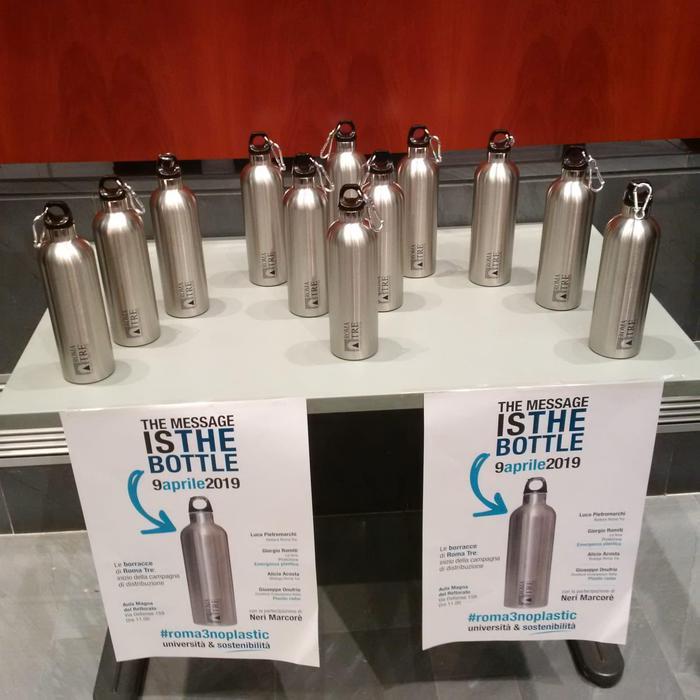 Già da ieri gli studenti possono ritirare la nuova “bottiglietta ecologica” negli otto punti di distribuzione allestiti presso l'università. L'iniziativa con cui Roma Tre dice no alla plastica è stata chiamata, giocando con il titolo di un celebre brano musicale dei Police, The Message Is The Bottle ed è stata presentata, sempre nella giornata di ieri, in Aula Magna dal rettore Luca Pietromarchi alla presenza dell'attore Neri Marcorè, dell'inviato della trasmissione Le Iene, Giorgio Romiti, e del direttore di Greenpeace, Giuseppe Onufrio.