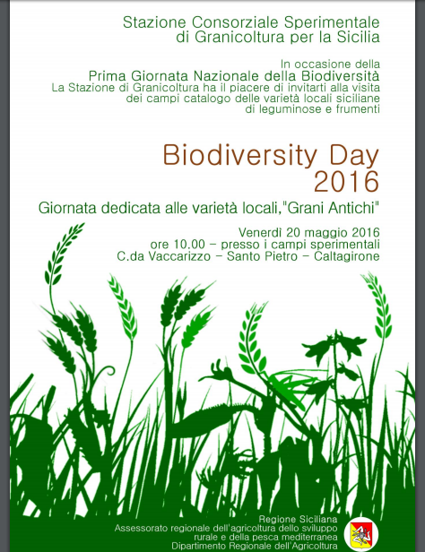 Venerdì 20 maggio 2016, La Stazione di Granicoltura, coadiuvata da numerosi sponsor della filiera dei Grani Antichi siciliani e supportata da molte organizzazioni no profit, è lieta di invitarvi al Biodiversity Day.