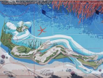 Due figure metamorfiche che si abbracciano con lo sguardo rivolto all’infinito. Raffigurano una la terra, l’altra il mare; attorno i coralli, i pesci capone, le conchiglie il faro di San Vito Lo Capo, la torre di Santa Crescenza.